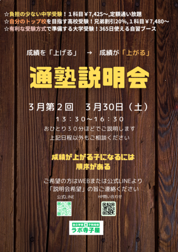 3月実施 通塾説明会 3/30(土)13:30~16:30 お気軽にご質問ください!