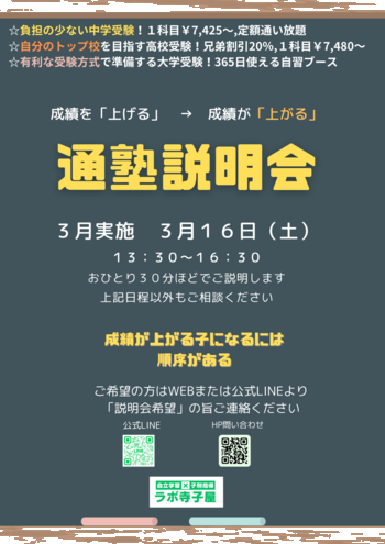 3月実施 通塾説明会 3/16(土)13:30~16:30 お気軽にご質問ください!