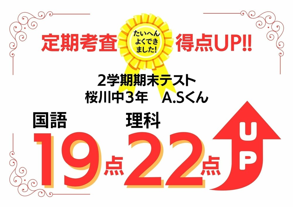 2023年2学期末テスト 桜川中3年 2科目40点UP!