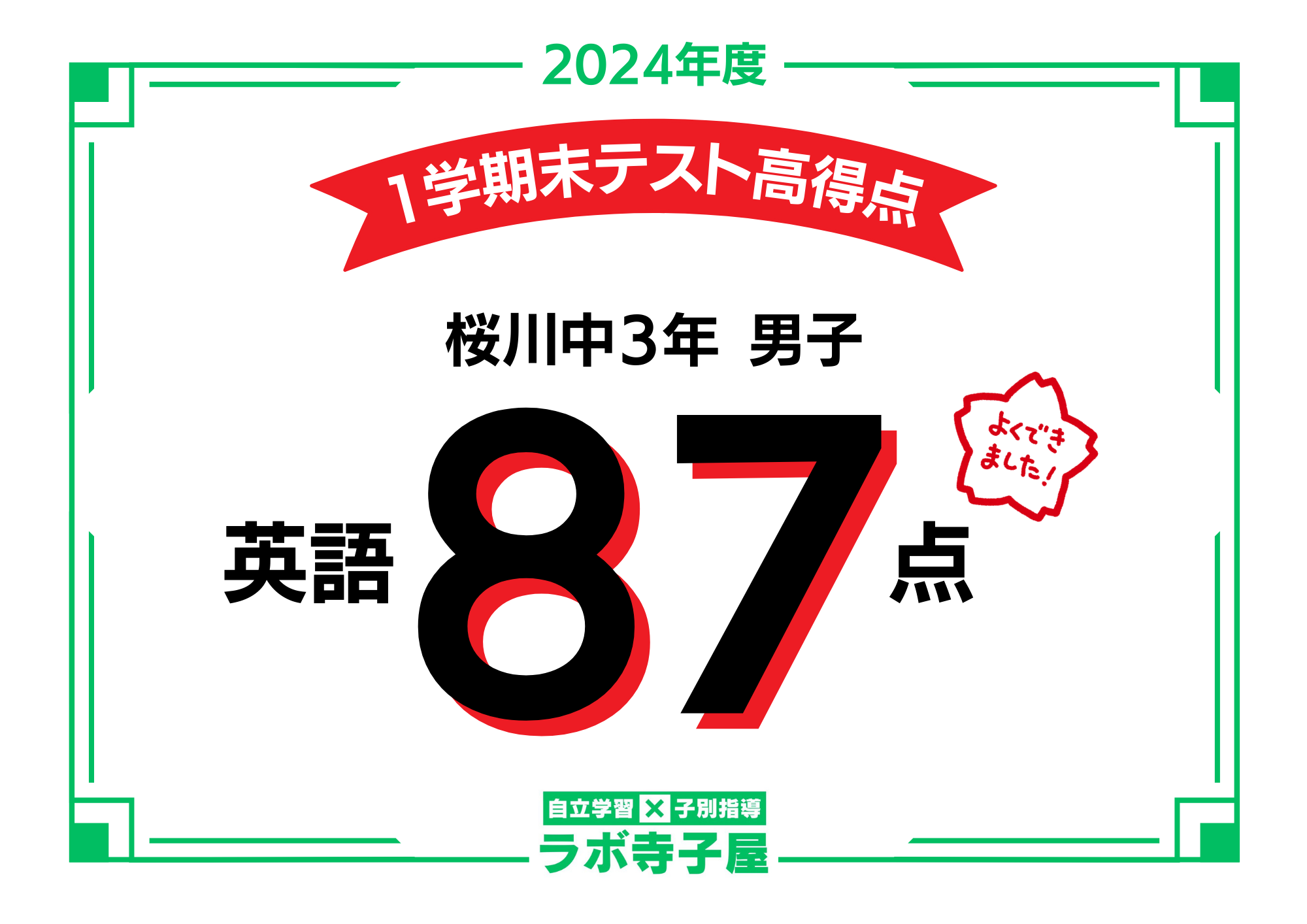 2024年1学期末テスト 桜川中3年 英語87点達成!|板橋・練馬・豊島区 GMARCH現役合格 総合学習塾ラボ寺子屋