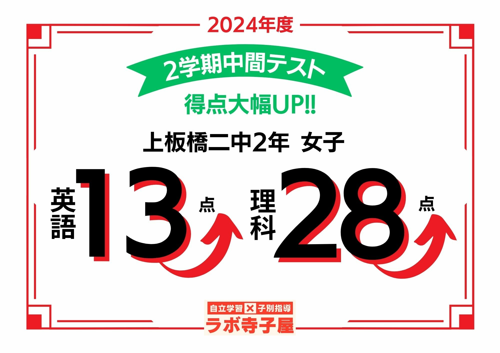 2024年2学期中間テスト 上二中2年 英語13点UP!理科28点UP!強烈UP|板橋・練馬・豊島区 GMARCH現役合格 総合学習塾ラボ寺子屋