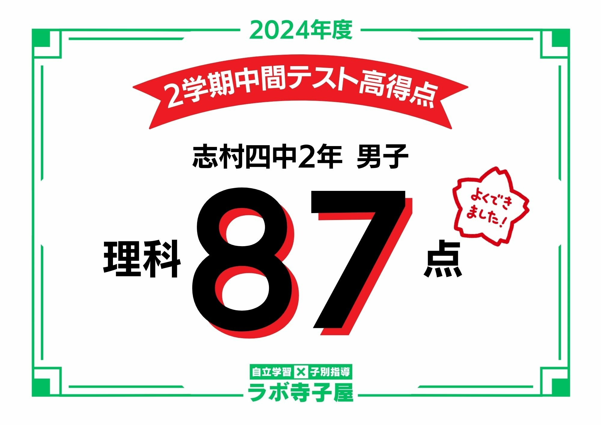 2024年2学期中間テスト 志村四中2年生 高得点87点獲得!|板橋・練馬・豊島区 GMARCH現役合格 総合学習塾ラボ寺子屋