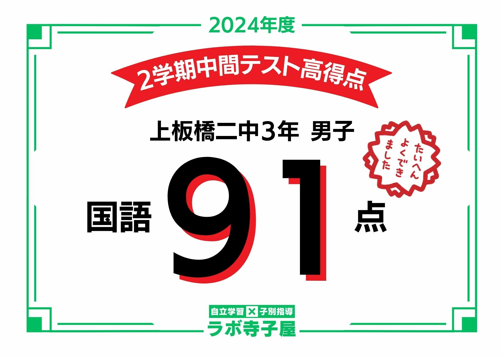 2学期中間テスト高得点!上板橋二中3年 国語91点!