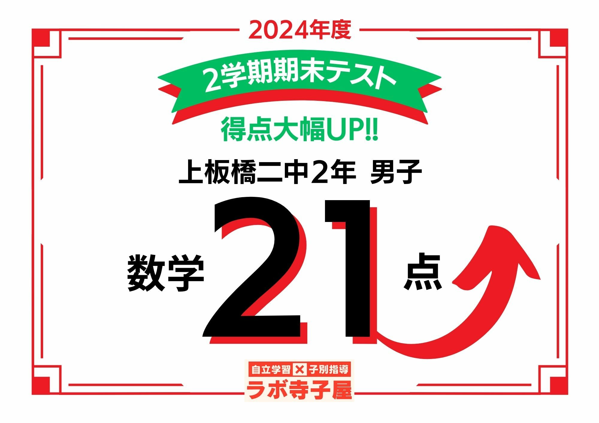2024年2学期期末テスト大幅得点アップ!上二中K君・数学|板橋・練馬・豊島区 GMARCH現役合格 総合学習塾ラボ寺子屋