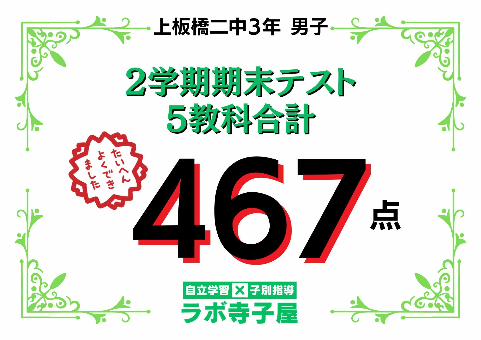 上二中3年生 5教科合計467点達成|板橋・練馬・豊島区 GMARCH現役合格 総合学習塾ラボ寺子屋
